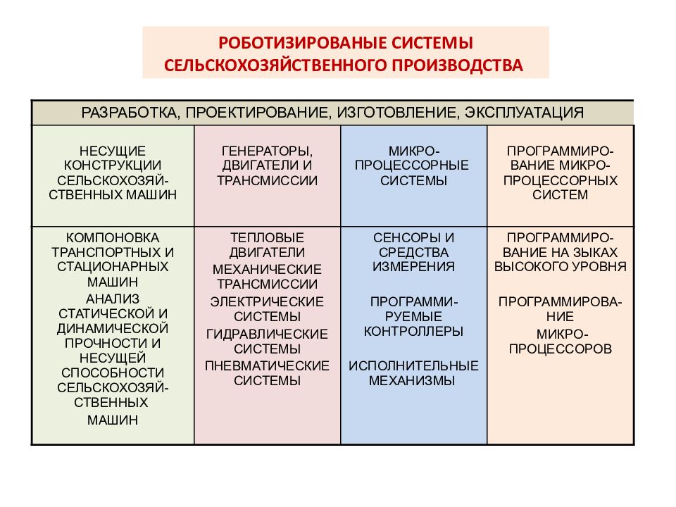 РОБОТИЗИРОВАНЫЕ СИСТЕМЫ СЕЛЬСКОХОЗЯЙСТВЕННОГО ПРОИЗВОДСТВА РАЗРАБОТКА, ПРОЕКТИРОВАНИЕ, ИЗГОТОВЛЕНИЕ, ЭКСПЛУАТАЦИЯ НЕСУЩИЕ КОНСТРУКЦИИ СЕЛЬСКОХОЗЯЙ-СТВЕННЫХ МАШИН ГЕНЕРАТОРЫ, ДВИГАТЕЛИ И ТРАНСМИССИИ МИКРО-ПРОЦЕССОРНЫЕ СИСТЕМЫ ПРОГРАММИРО-ВАНИЕ МИКРО-ПРОЦЕССОРНЫХ СИСТЕМ КОМПОНОВКА ТРАНСПОРТНЫХ И СТАЦИОНАРНЫХ МАШИН АНАЛИЗ СТАТИЧЕСКОЙ И ДИНАМИЧЕСКОЙ ПРОЧНОСТИ И НЕСУЩЕЙ СПОСОБНОСТИ СЕЛЬСКОХОЗЯЙ-СТВЕННЫХ МАШИН ТЕПЛОВЫЕ ДВИГАТЕЛИ МЕХАНИЧЕСКИЕ ТРАНСМИССИИ ЭЛЕКТРИЧЕСКИЕ СИСТЕМЫ ГИДРАВЛИЧЕСКИЕ СИСТЕМЫ ПНЕВМАТИЧЕСКИЕ СИСТЕМЫ СЕНСОРЫ И СРЕДСТВА ИЗМЕРЕНИЯ ПРОГРАММИ-РУЕМЫЕ КОНТРОЛЛЕРЫ ИСПОЛНИТЕЛЬНЫЕ МЕХАНИЗМЫ ПРОГРАММИРО-ВАНИЕ НА ЗЫКАХ ВЫСОКОГО УРОВНЯ ПРОГРАММИРОВА-НИЕ МИКРО-ПРОЦЕССОРОВ