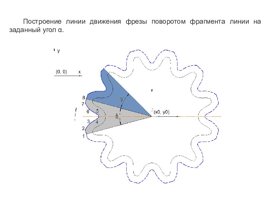 Построение линии движения фрезы поворотом фрагмента линии на заданный угол α.