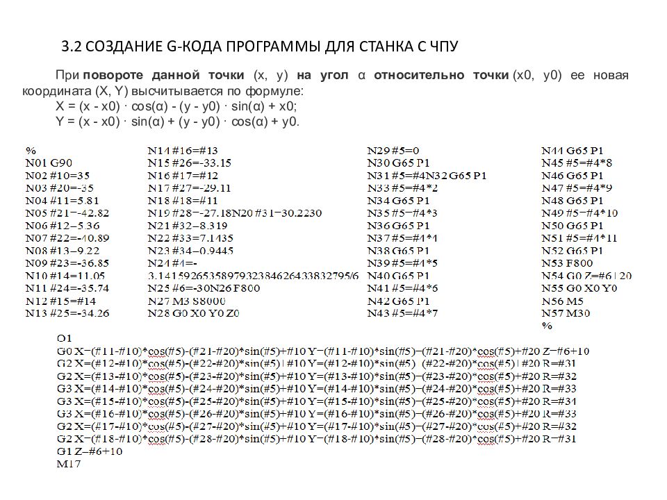 3.2 СОЗДАНИЕ G- КОДА ПРОГРАММЫ ДЛЯ СТАНКА С ЧПУ При повороте данной точки (x, y) на угол α относительно точки (x0, y0) ее новая координата (X, Y) высчитывается по формуле: X = (x - x0) · cos(α) - (y - y0) · sin(α) + x0; Y = (x - x0) · sin(α) + (y - y0) · cos(α) + y0.