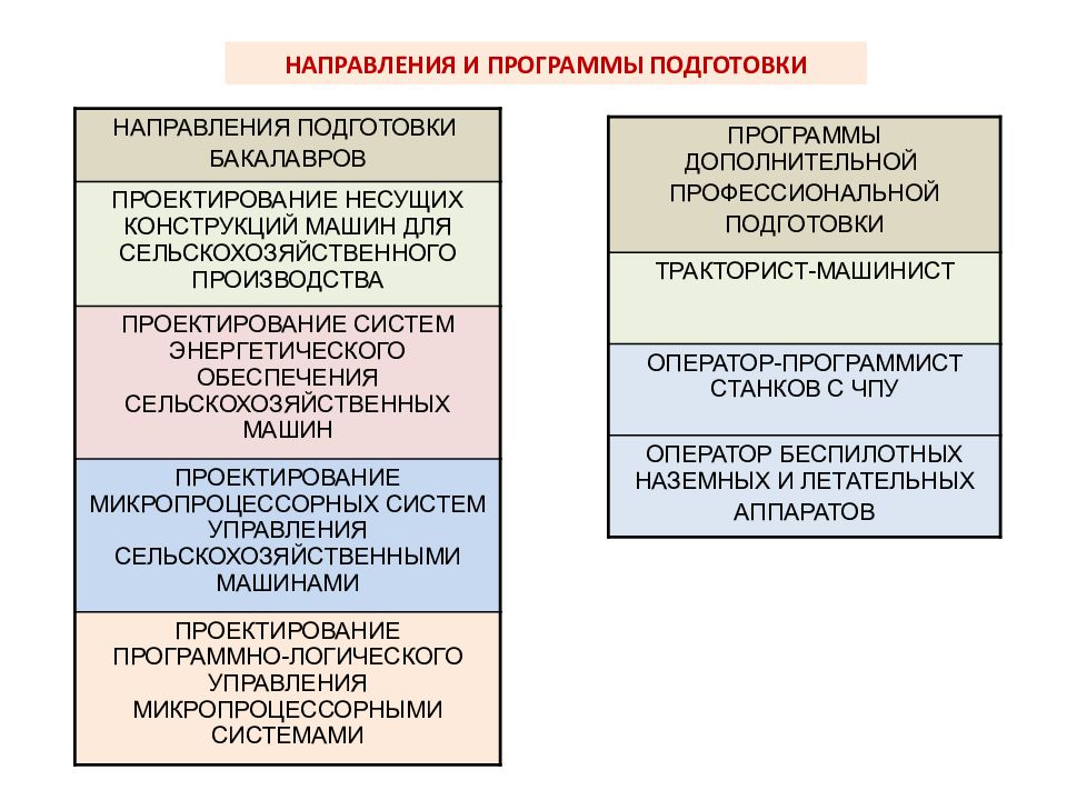 НАПРАВЛЕНИЯ ПОДГОТОВКИ БАКАЛАВРОВ ПРОЕКТИРОВАНИЕ НЕСУЩИХ КОНСТРУКЦИЙ МАШИН ДЛЯ СЕЛЬСКОХОЗЯЙСТВЕННОГО ПРОИЗВОДСТВА ПРОЕКТИРОВАНИЕ СИСТЕМ ЭНЕРГЕТИЧЕСКОГО ОБЕСПЕЧЕНИЯ СЕЛЬСКОХОЗЯЙСТВЕННЫХ МАШИН ПРОЕКТИРОВАНИЕ МИКРОПРОЦЕССОРНЫХ СИСТЕМ УПРАВЛЕНИЯ СЕЛЬСКОХОЗЯЙСТВЕННЫМИ МАШИНАМИ ПРОЕКТИРОВАНИЕ ПРОГРАММНО-ЛОГИЧЕСКОГО УПРАВЛЕНИЯ МИКРОПРОЦЕССОРНЫМИ СИСТЕМАМИ ПРОГРАММЫ ДОПОЛНИТЕЛЬНОЙ ПРОФЕССИОНАЛЬНОЙ ПОДГОТОВКИ ТРАКТОРИСТ-МАШИНИСТ ОПЕРАТОР-ПРОГРАММИСТ СТАНКОВ С ЧПУ ОПЕРАТОР БЕСПИЛОТНЫХ НАЗЕМНЫХ И ЛЕТАТЕЛЬНЫХ АППАРАТОВ НАПРАВЛЕНИЯ И ПРОГРАММЫ ПОДГОТОВКИ