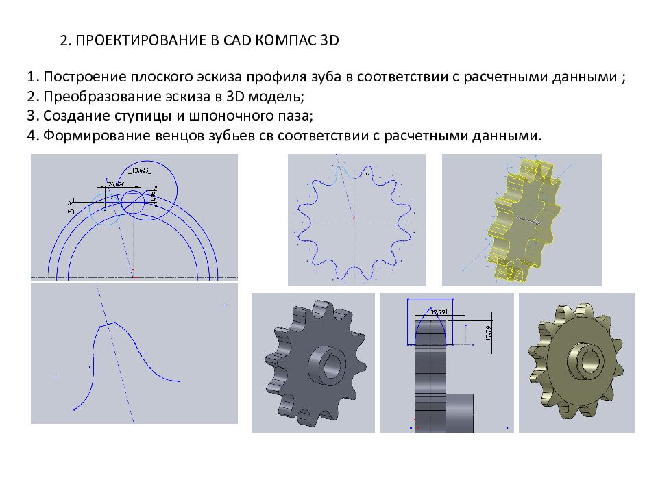 2. ПРОЕКТИРОВАНИЕ В CAD КОМПАС 3 D 1. Построение плоского эскиза профиля зуба в соответствии с расчетными данными ; 2. Преобразование эскиза в 3D модель; 3. Создание ступицы и шпоночного паза; 4. Формирование венцов зубьев св соответствии с расчетными данными.