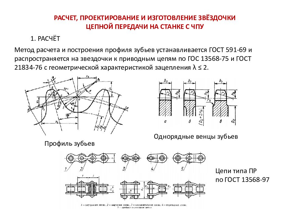 РАСЧЕТ, ПРОЕКТИРОВАНИЕ И ИЗГОТОВЛЕНИЕ ЗВЁЗДОЧКИ ЦЕПНОЙ ПЕРЕДАЧИ НА СТАНКЕ С ЧПУ 1. РАСЧЁТ Метод расчета и построения профиля зубьев устанавливается ГОСТ 591-69 и распространяется на звездочки к приводным цепям по ГОС 13568-75 и ГОСТ 21834-76 с геометрической характеристикой зацепления λ ≤ 2. Профиль зубьев Однорядные венцы зубьев Цепи типа ПР по ГОСТ 13568-97