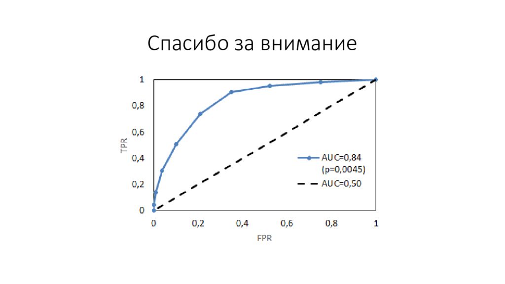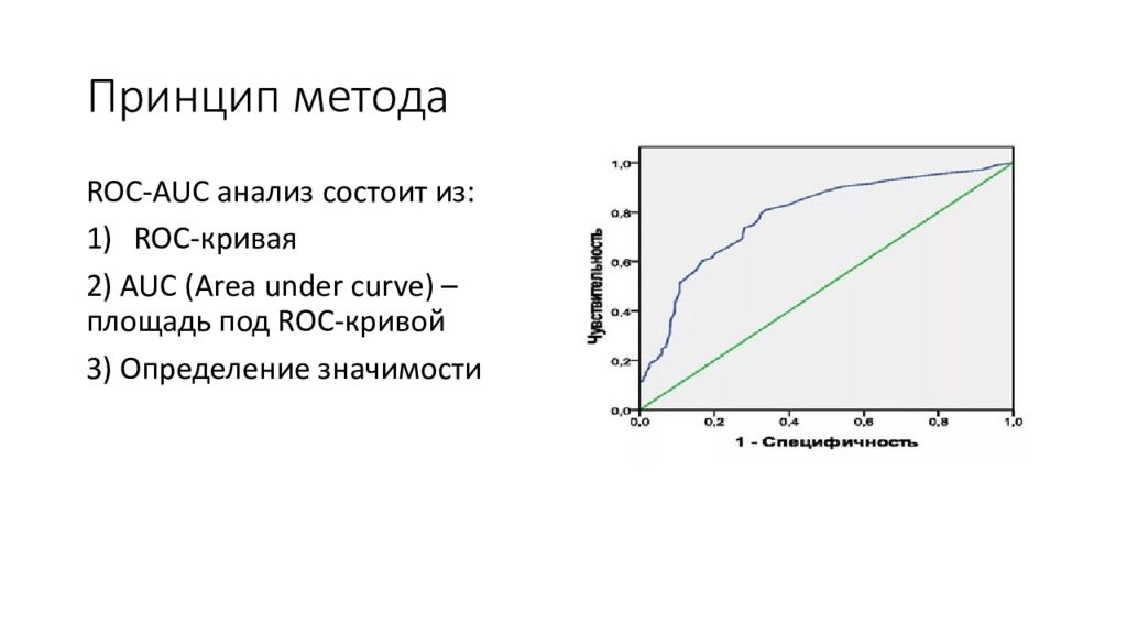 ROC-AUC анализ состоит из : ROC- кривая 2) AUC (Area under curve) – площадь под ROC- кривой 3) Определение значимости