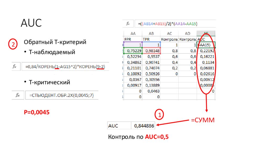 Контроль по AUC=0,5 =C УММ 1 2 Обратный Т-критерий Т-наблюдаемый Т-критический P=0,0045