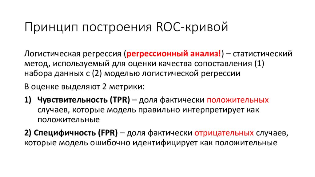 Логистическая регрессия ( регрессионный анализ ! ) – статистический метод, используемый для оценки качества сопоставления (1) набора данных с (2) моделью логистической регрессии В оценке выделяют 2 метрики : Чувствительность ( TPR) – доля фактически положительных случаев, которые модель правильно интерпретирует как положительные 2) Специфичность (FPR) – доля фактически отрицательных случаев, которые модель ошибочно идентифицирует как положительные