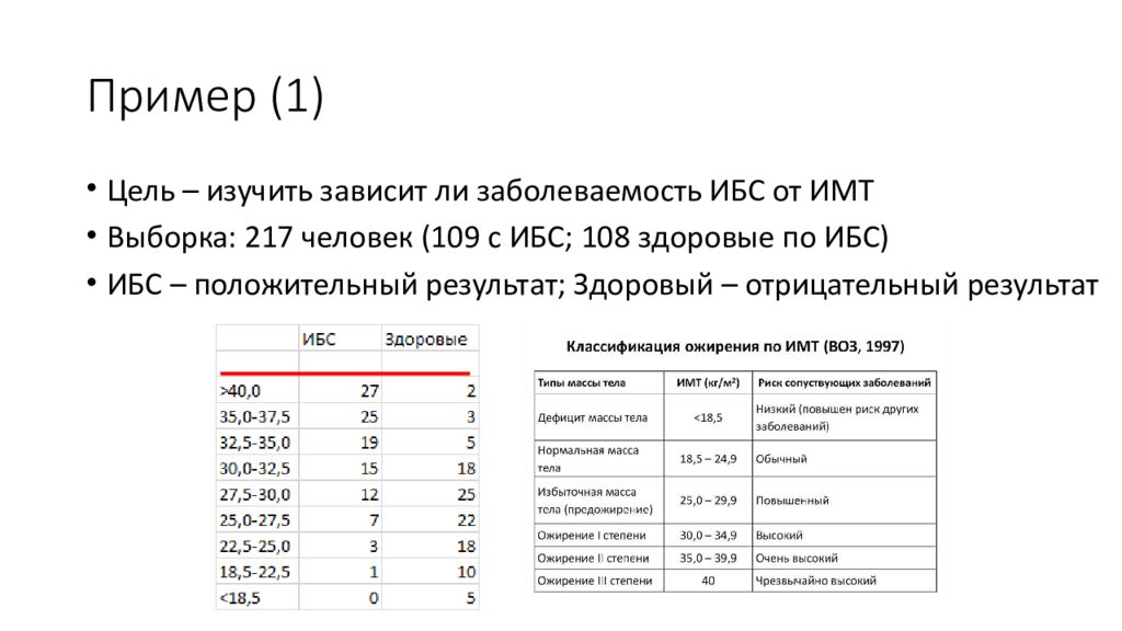 Цель – изучить зависит ли заболеваемость ИБС от ИМТ Выборка : 217 человек (109 с ИБС ; 108 здоровые по ИБС) ИБС – положительный результат ; Здоровый – отрицательный результат