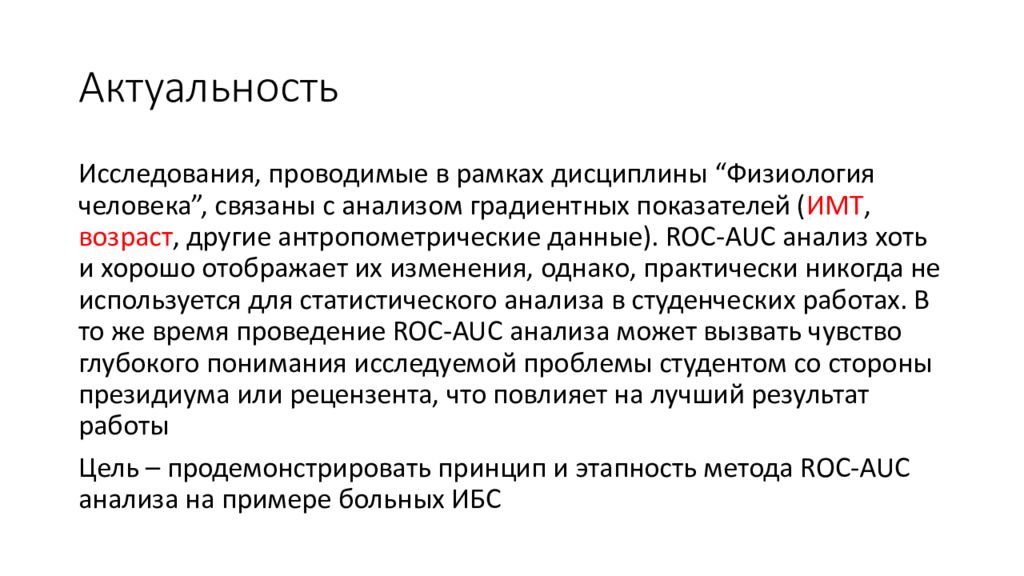 Исследования, проводимые в рамках дисциплины “ Физиология человека ”, связаны с анализом градиентных показателей ( ИМТ, возраст, другие антропометрические данные). ROC-AUC анализ хоть и хорошо отображает их изменения, однако, практически никогда не используется для статистического анализа в студенческих работах. В то же время проведение ROC-AUC анализа может вызвать чувство глубокого понимания исследуемой проблемы студентом со стороны президиума или рецензента, что повлияет на лучший результат работы Цель – продемонстрировать принцип и этапность метода ROC-AUC анализа на примере больных ИБС