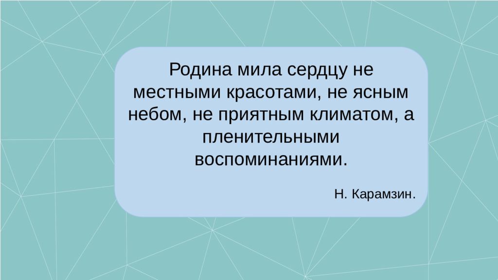 Родина мила сердцу не местными красотами, не ясным небом, не приятным климатом, а пленительными воспоминаниями. Н. Карамзин.