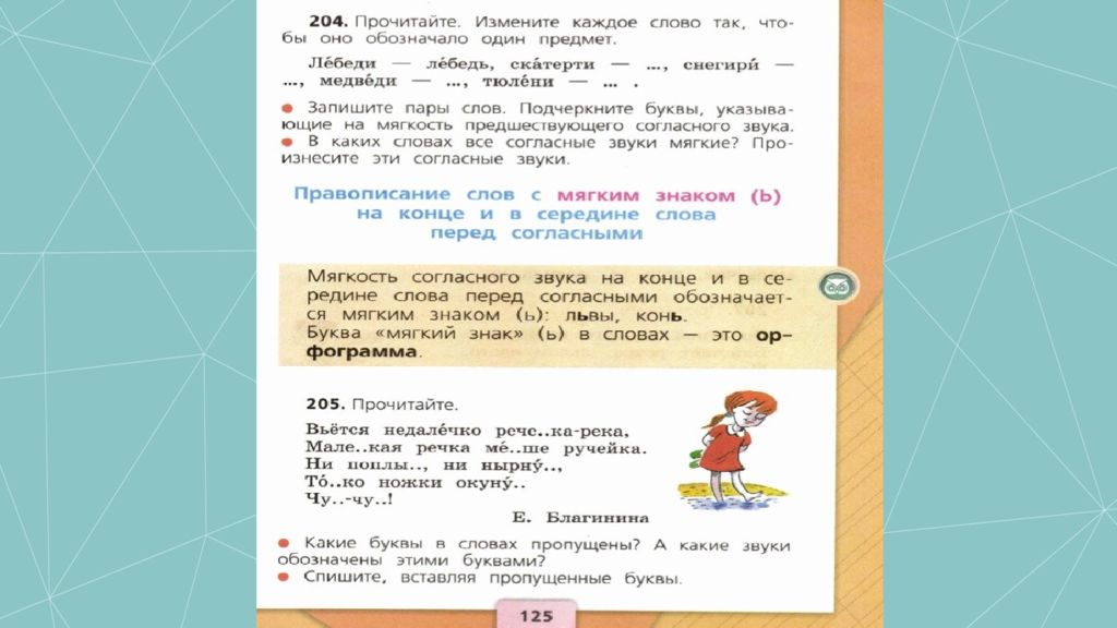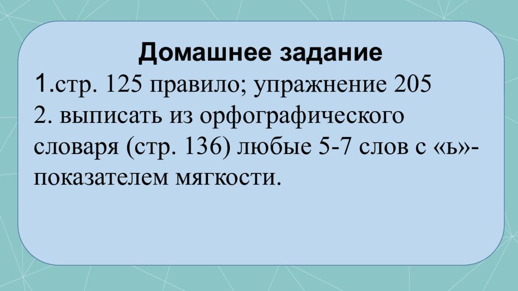 Домашнее задание 1. стр. 125 правило; упражнение 205 2. выписать из орфографического словаря (стр. 136) любые 5-7 слов с «ь»- показателем мягкости.