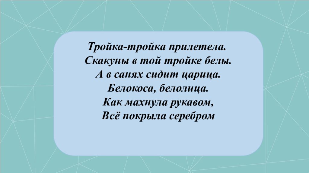 Тройка-тройка прилетела. Скакуны в той тройке белы. А в санях сидит царица. Белокоса, белолица. Как махнула рукавом, Всё покрыла серебром