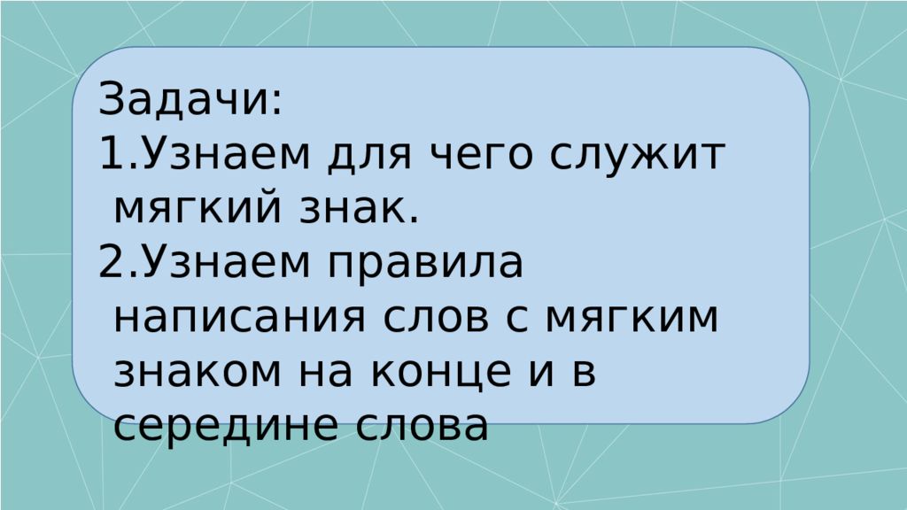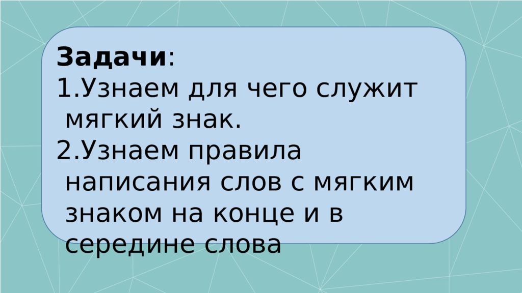 Задачи: Узнаем для чего служит мягкий знак. Узнаем правила написания слов с мягким знаком на конце и в середине слова