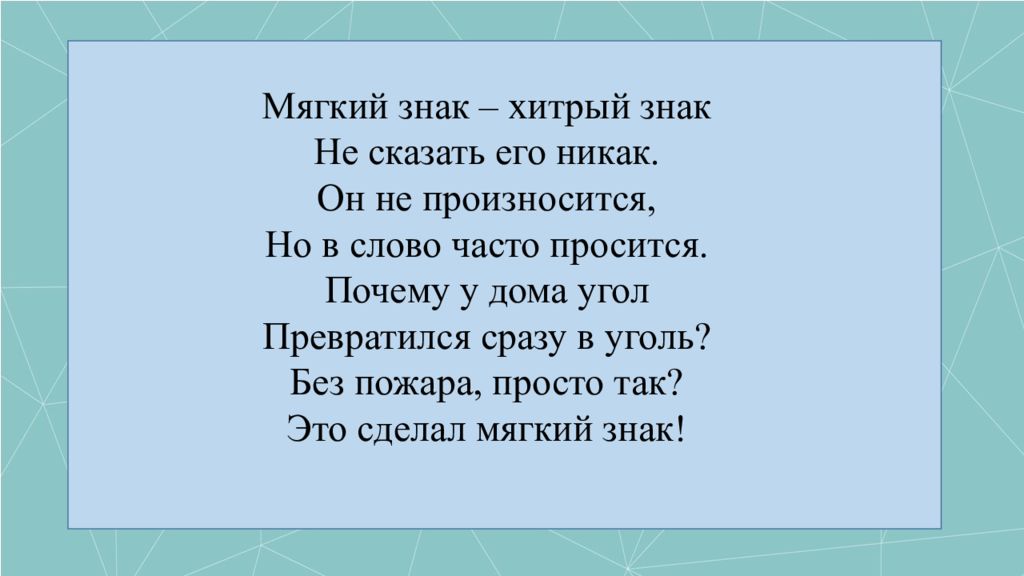 Мягкий знак – хитрый знак Не сказать его никак. Он не произносится, Но в слово часто просится. Почему у дома угол Превратился сразу в уголь? Без пожара, просто так? Это сделал мягкий знак!