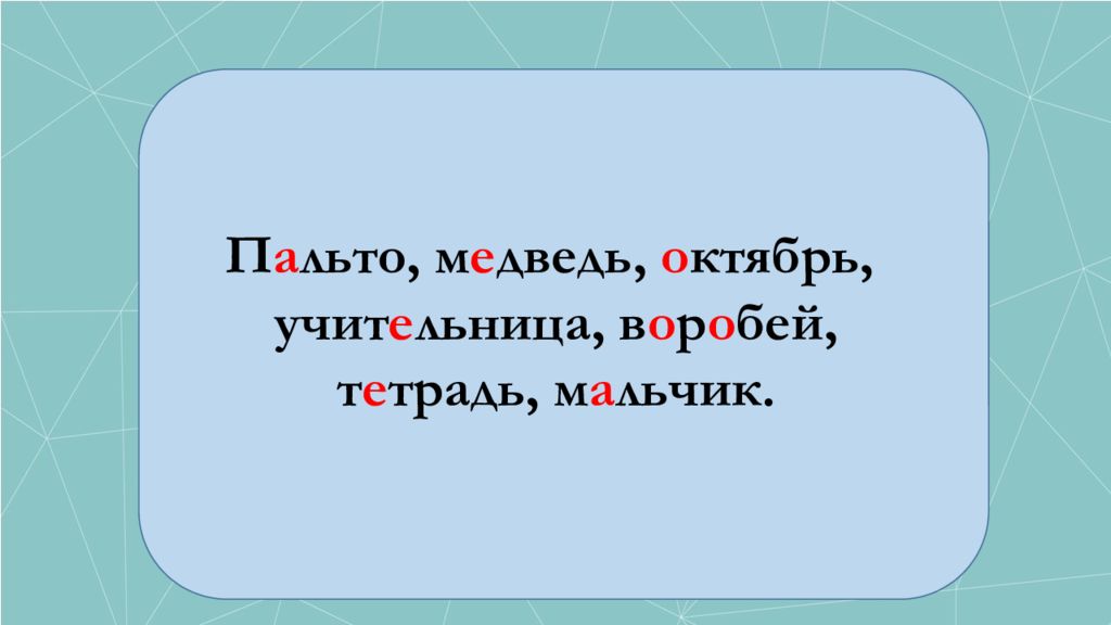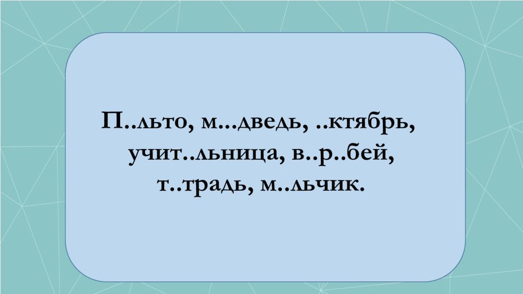 П.. льто, м... дведь,.. ктябрь, учит.. льница, в..р..бей, т.. традь, м.. льчик.