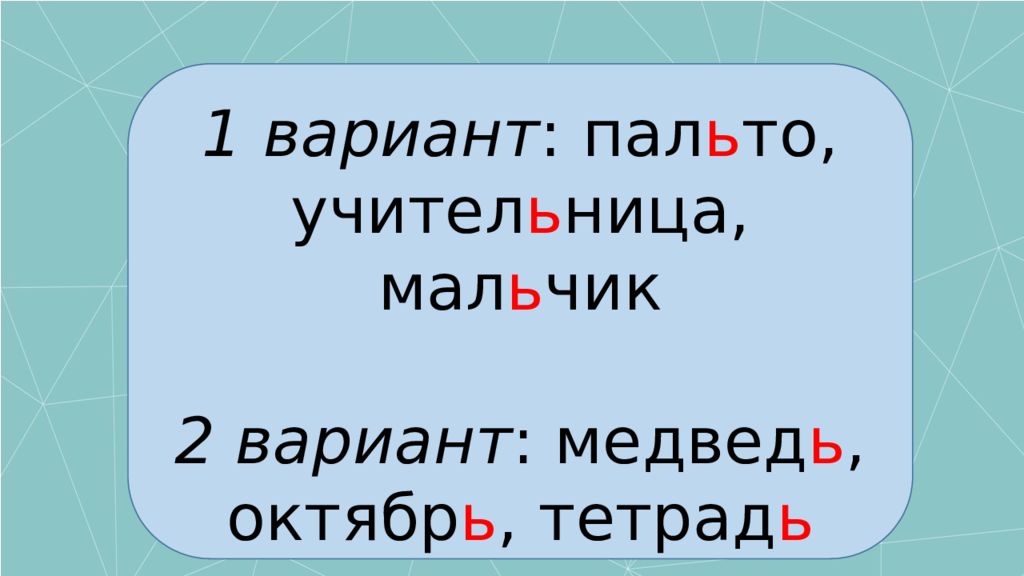 1 вариант : пал ь то, учител ь ница, мал ь чик 2 вариант : медвед ь, октябр ь, тетрад ь