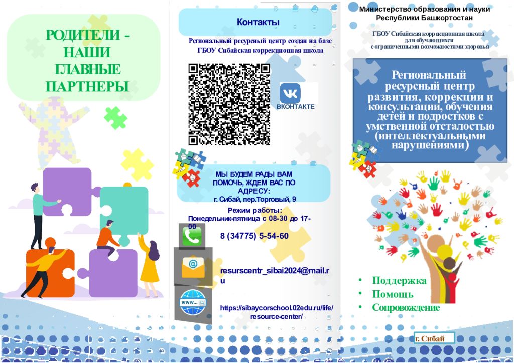 г. Сибай Поддержка Помощь Сопровождени е Региональный ресурсный центр развития, коррекции и консультации, обучения детей и подростков с умственной отсталостью (интеллектуальными нарушениями ) ГБОУ Сибайская коррекционная школа для обучающихся с ограниченными возможностями здоровья Контакты Региональный ресурсный центр создан на базе ГБОУ Сибайская коррекционная школа МЫ БУДЕМ РАДЫ ВАМ ПОМОЧЬ, ЖДЕМ ВАС ПО АДРЕСУ: г. Сибай, пер.Торговый, 9 Режим работы: Понедельник-пятница с 08-30 до 17- 00 8 (34775) 5-54-60 resurscentr_sibai2024@mail.ru https://sibaycorschool.02edu.ru/life/resource-center/ РОДИТЕЛИ - НАШИ ГЛАВНЫЕ ПАРТНЕРЫ ВКОНТАКТЕ Министерство образования и науки Республики Башкортостан