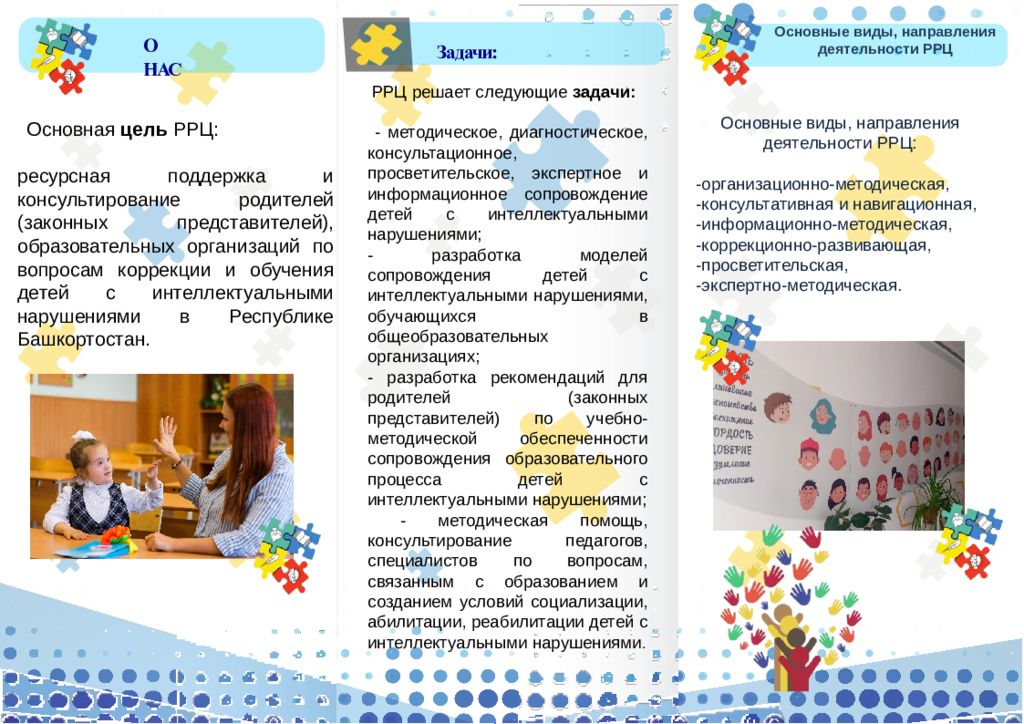 О НАС Задачи : Основная цель РРЦ: ресурсная поддержка и консультирование родителей (законных представителей), образовательных организаций по вопросам коррекции и обучения детей с интеллектуальными нарушениями в Республике Башкортостан. Основные виды, направления деятельности РРЦ: -организационно-методическая, -консультативная и навигационная, -информационно-методическая, -коррекционно-развивающая, -просветительская, -экспертно-методическая. РРЦ решает следующие задачи: - методическое, диагностическое, консультационное, просветительское, экспертное и информационное сопровождение детей с интеллектуальными нарушениями; - разработка моделей сопровождения детей с интеллектуальными нарушениями, обучающихся в общеобразовательных организациях; - разработка рекомендаций для родителей (законных представителей) по учебно-методической обеспеченности сопровождения образовательного процесса детей с интеллектуальными нарушениями; - методическая помощь, консультирование педагогов, специалистов по вопросам, связанным с образованием и созданием условий социализации, абилитации, реабилитации детей с интеллектуальными нарушениями. Основные виды, направления деятельности РРЦ