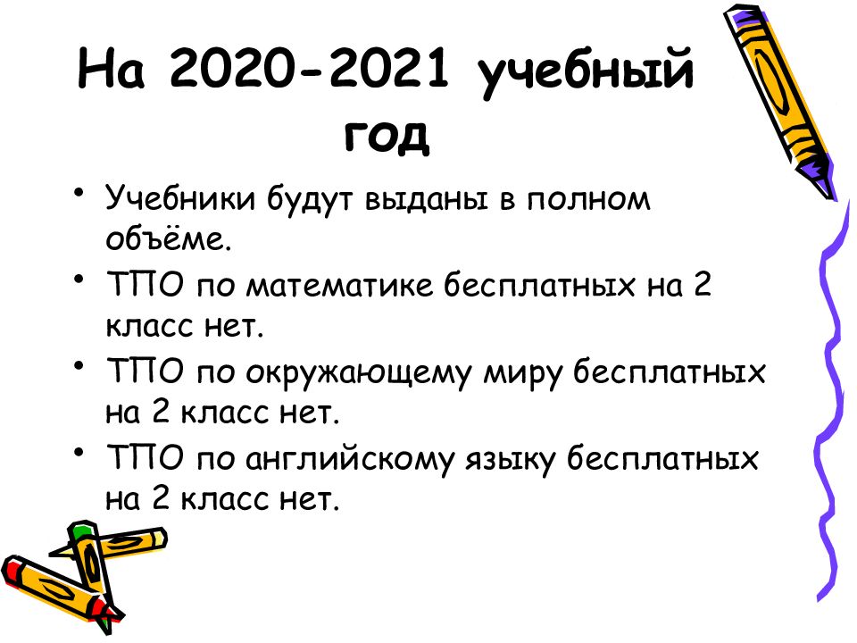 Учебники будут выданы в полном объёме. ТПО по математике бесплатных на 2 класс нет. ТПО по окружающему миру бесплатных на 2 класс нет. ТПО по английскому языку бесплатных на 2 класс нет.