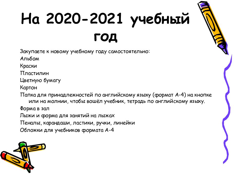 Закупаете к новому учебному году самостоятельно: Альбом Краски Пластилин Цветную бумагу Картон Папка для принадлежностей по английскому языку (формат А-4) на кнопке или на молнии, чтобы вошёл учебник, тетрадь по английскому языку. Форма в зал Лыжи и форма для занятий на лыжах Пеналы, карандаши, ластики, ручки, линейки Обложки для учебников формата А-4