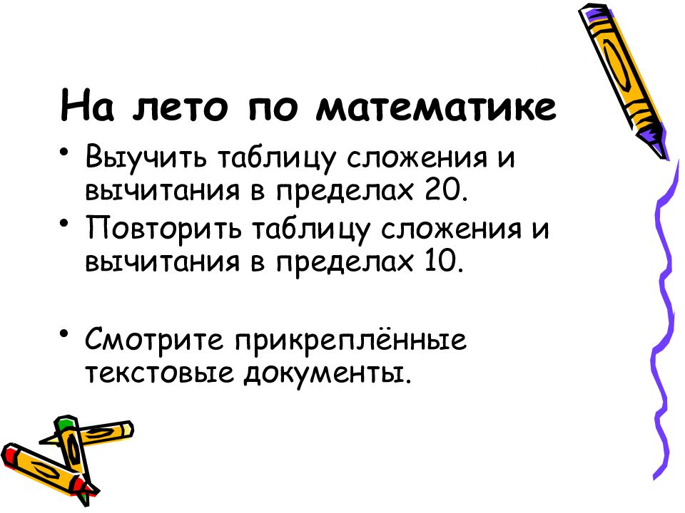 Выучить таблицу сложения и вычитания в пределах 20. Повторить таблицу сложения и вычитания в пределах 10. Смотрите прикреплённые текстовые документы.