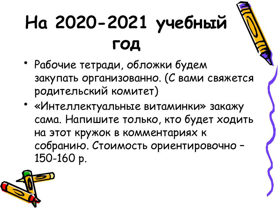 Рабочие тетради, обложки будем закупать организованно. (С вами свяжется родительский комитет) «Интеллектуальные витаминки» закажу сама. Напишите только, кто будет ходить на этот кружок в комментариях к собранию. Стоимость ориентировочно – 150-160 р.