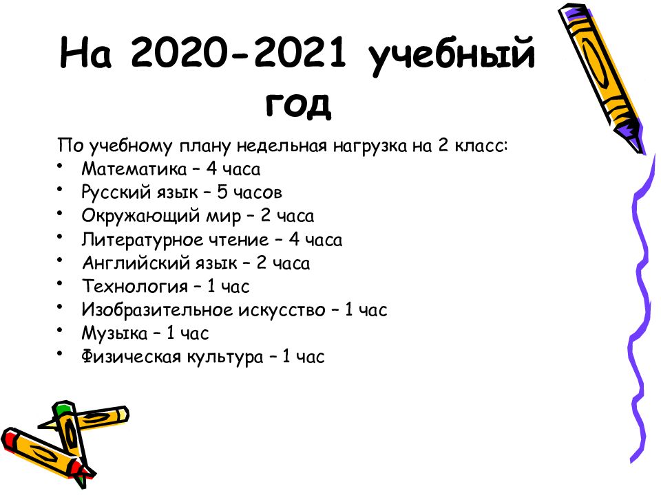 По учебному плану недельная нагрузка на 2 класс: Математика – 4 часа Русский язык – 5 часов Окружающий мир – 2 часа Литературное чтение – 4 часа Английский язык – 2 часа Технология – 1 час Изобразительное искусство – 1 час Музыка – 1 час Физическая культура – 1 час