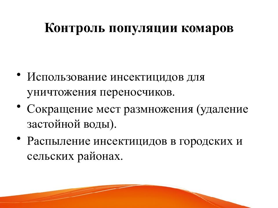 Использование инсектицидов для уничтожения переносчиков. Сокращение мест размножения (удаление застойной воды). Распыление инсектицидов в городских и сельских районах.