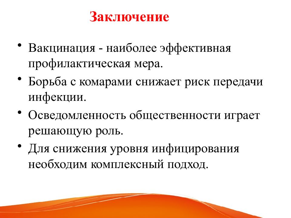 Вакцинация - наиболее эффективная профилактическая мера. Борьба с комарами снижает риск передачи инфекции. Осведомленность общественности играет решающую роль. Для снижения уровня инфицирования необходим комплексный подход.