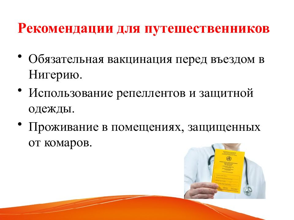 Обязательная вакцинация перед въездом в Нигерию. Использование репеллентов и защитной одежды. Проживание в помещениях, защищенных от комаров.
