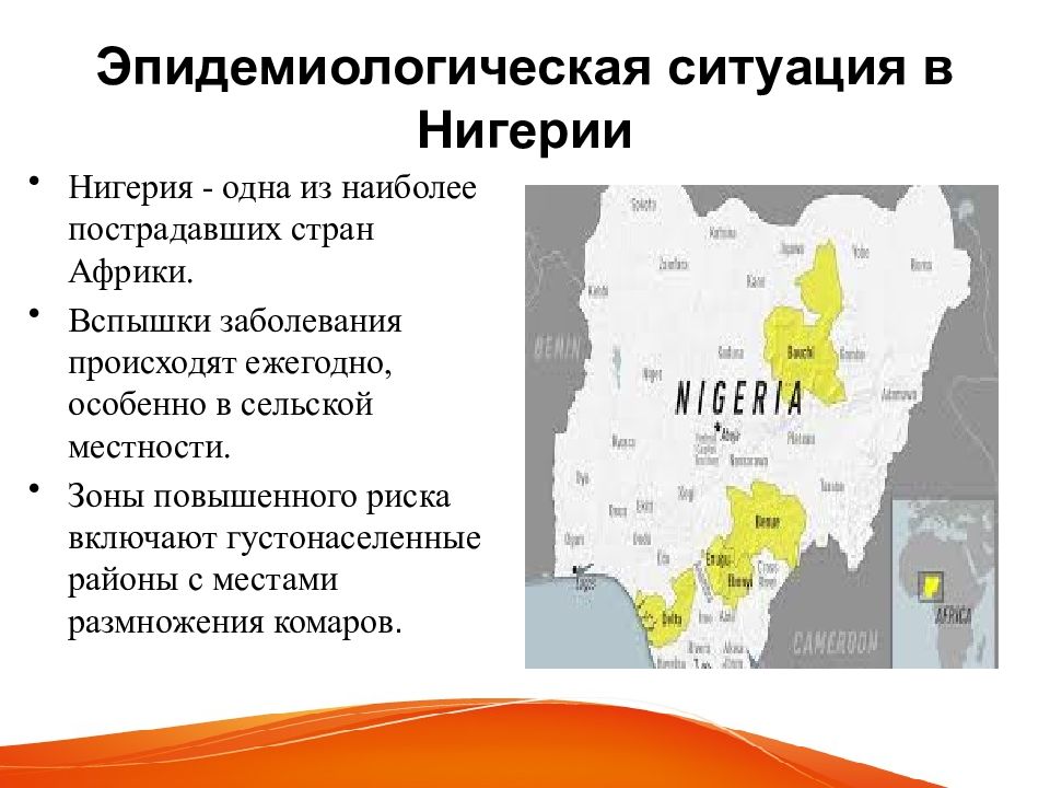 Нигерия - одна из наиболее пострадавших стран Африки. Вспышки заболевания происходят ежегодно, особенно в сельской местности. Зоны повышенного риска включают густонаселенные районы с местами размножения комаров.