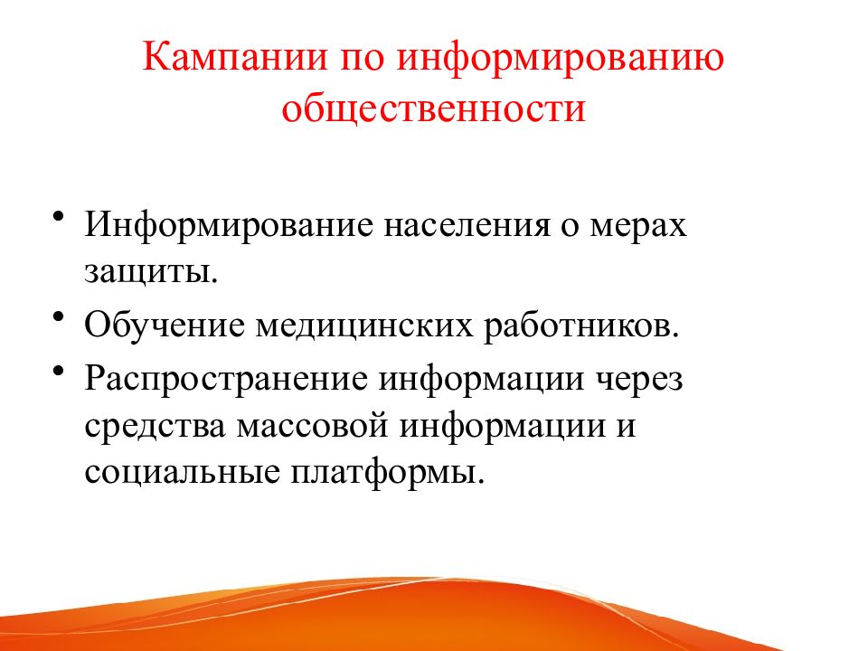 Информирование населения о мерах защиты. Обучение медицинских работников. Распространение информации через средства массовой информации и социальные платформы.