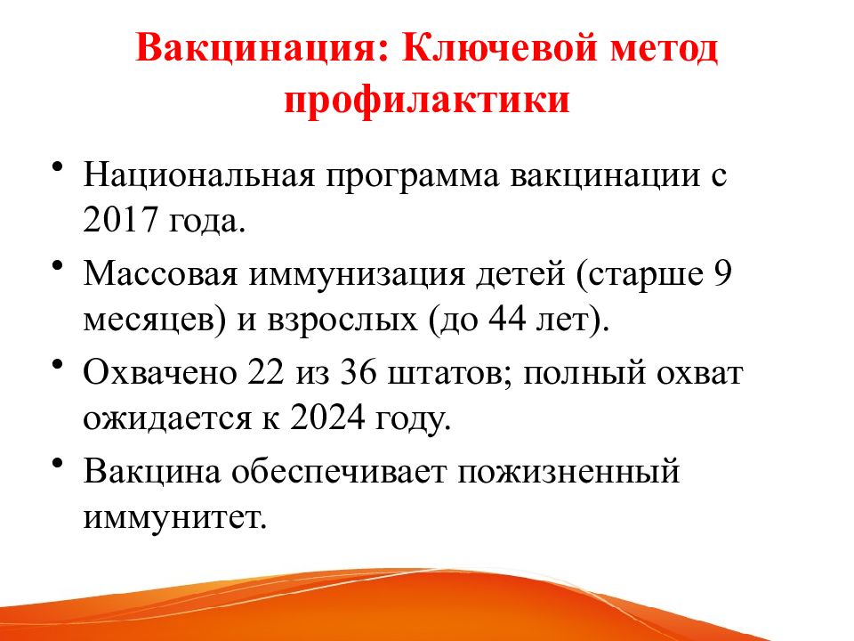 Национальная программа вакцинации с 2017 года. Массовая иммунизация детей (старше 9 месяцев) и взрослых (до 44 лет). Охвачено 22 из 36 штатов; полный охват ожидается к 2024 году. Вакцина обеспечивает пожизненный иммунитет.