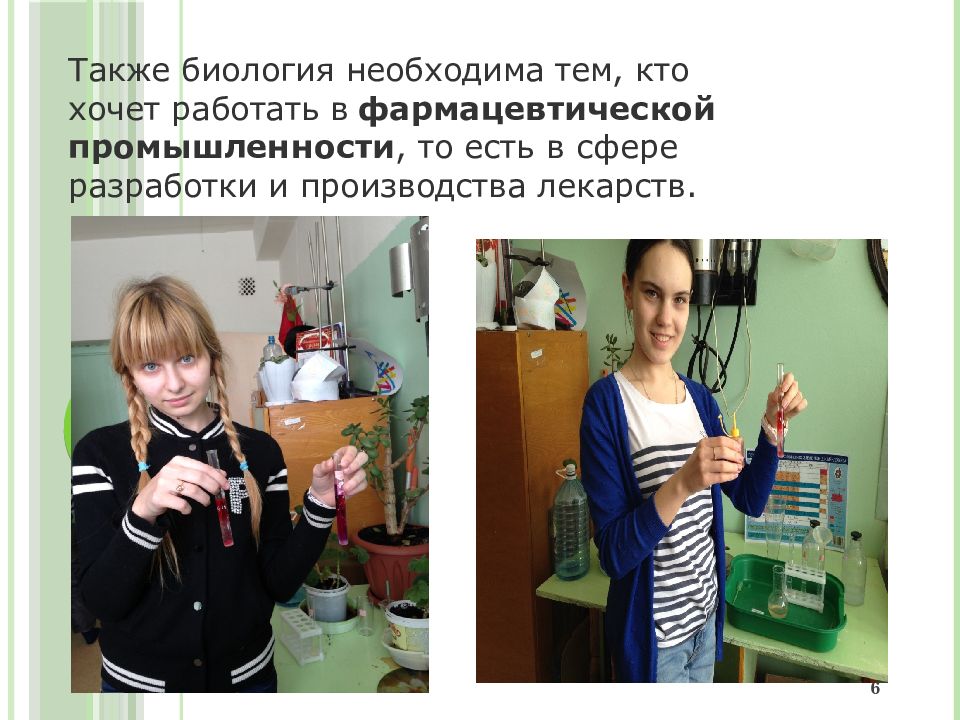 6 Также биология необходима тем, кто хочет работать в фармацевтической промышленности, то есть в сфере разработки и производства лекарств.