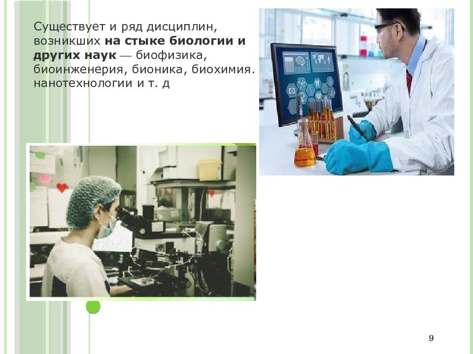 9 Существует и ряд дисциплин, возникших на стыке биологии и других наук — биофизика, биоинженерия, бионика, биохимия. нанотехнологии и т. д