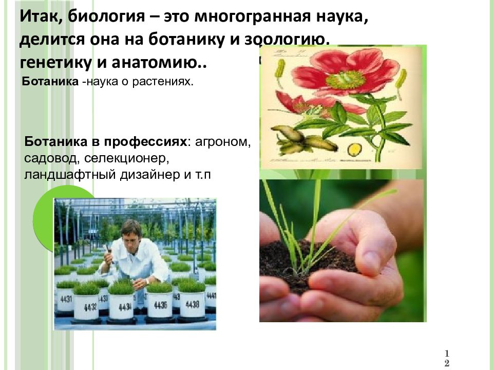 12 Итак, биология – это многогранная наука, делится она на ботанику и зоологию, генетику и анатомию.. Ботаника -наука о растениях. Ботаника в профессиях : агроном, садовод, селекционер, ландшафтный дизайнер и т.п