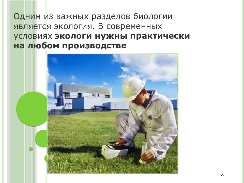 8 Одним из важных разделов биологии является экология. В современных условиях экологи нужны практически на любом производстве