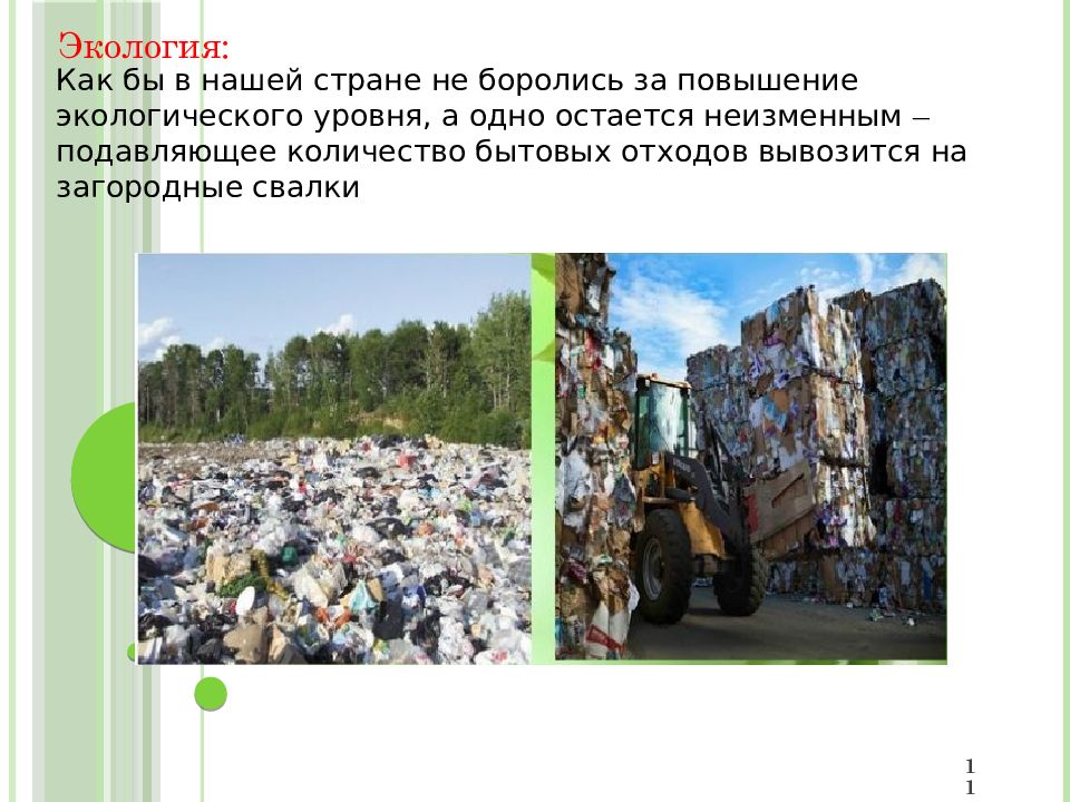 11 Экология: Как бы в нашей стране не боролись за повышение экологического уровня, а одно остается неизменным – подавляющее количество бытовых отходов вывозится на загородные свалки