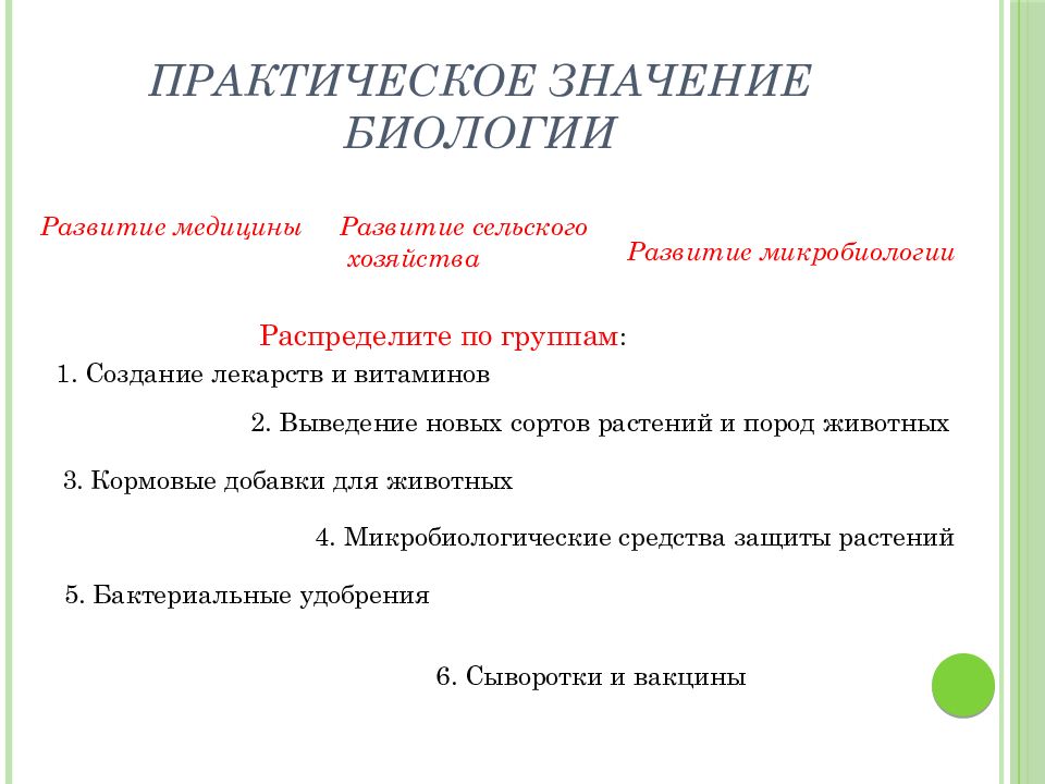 Развитие медицины Развитие сельского хозяйства Развитие микробиологии Распределите по группам : 1. Создание лекарств и витаминов 2. Выведение новых сортов растений и пород животных 3. Кормовые добавки для животных 4. Микробиологические средства защиты растений 5. Бактериальные удобрения 6. Сыворотки и вакцины
