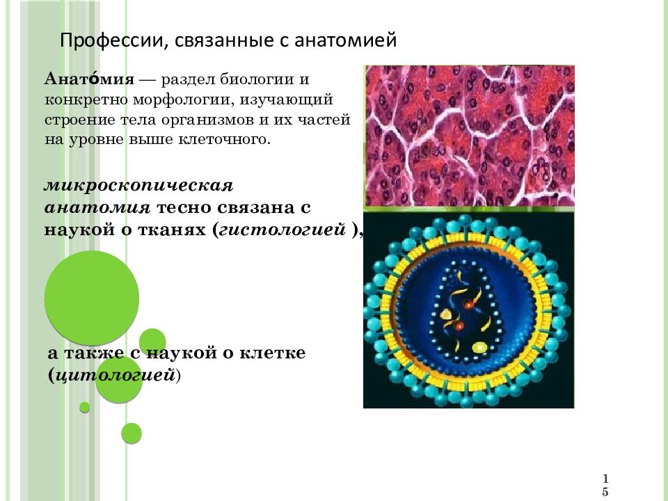 15 Профессии, связанные с анатомией Анато́мия — раздел биологии и конкретно морфологии, изучающий строение тела организмов и их частей на уровне выше клеточного. микроскопическая анатомия тесно связана с наукой о тканях ( гистологией ), а также с наукой о клетке ( цитологией )