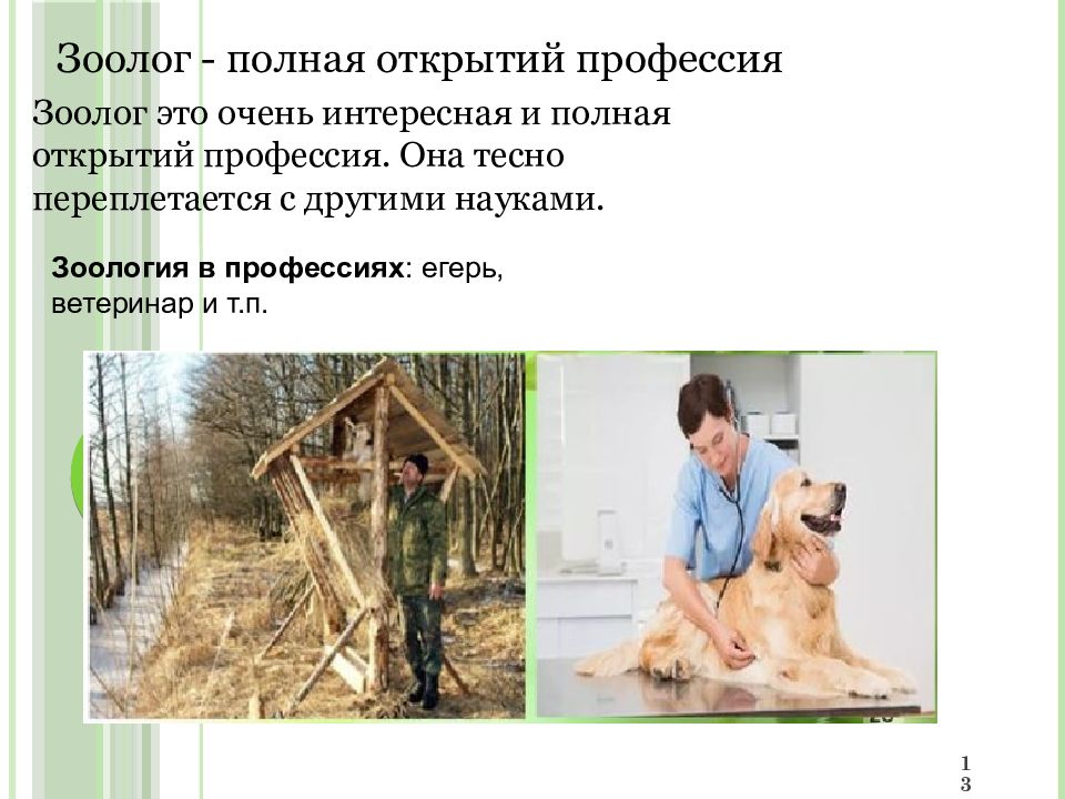 13 Зоолог - полная открытий профессия Зоолог это очень интересная и полная открытий профессия. Она тесно переплетается с другими науками. Зоология в профессиях : егерь, ветеринар и т.п.