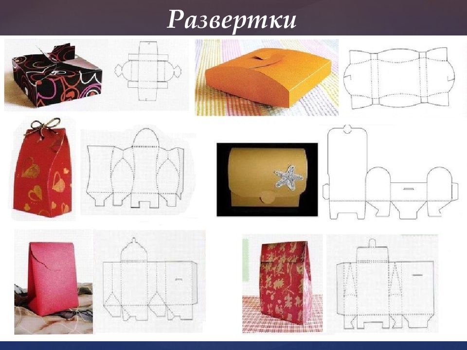 Задание: Сделать одну упаковку (парфюмерную, канцелярскую, кондитерскую и т.д.), используя разметки на слайде 7 и 8. Можете придумать свою.