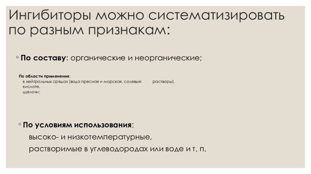По составу : органические и неорганические; По области применения : в нейтральных средах (вода пресная и морская, солевые растворы), кислоте, щелочи; По условиям использования : высоко- и низкотемпературные, растворимые в углеводородах или воде и т. п.