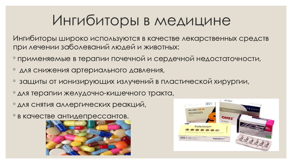 Ингибиторы широко используются в качестве лекарственных средств при лечении заболеваний людей и животных: применяемые в терапии почечной и сердечной недостаточности, для снижения артериального давления, защиты от ионизирующих излучений в пластической хирургии, для терапии желудочно-кишечного тракта, для снятия аллергических реакций, в качестве антидепрессантов. Ингибиторы в медицине