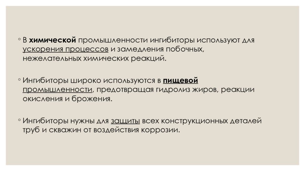 В химической промышленности ингибиторы используют для ускорения процессов и замедления побочных, нежелательных химических реакций. Ингибиторы нужны для защиты всех конструкционных деталей труб и скважин от воздействия коррозии. Ингибиторы широко используются в пищевой промышленности, предотвращая гидролиз жиров, реакции окисления и брожения.