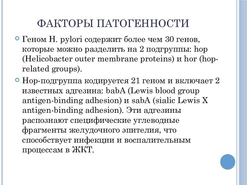 Геном Н. pylori содержит более чем 30 генов, которые можно разделить на 2 подгруппы: hop ( Helicobacter outer membrane proteins ) и hor ( hop - related groups ). Нор-подгруппа кодируется 21 геном и включает 2 известных адгезина : babA ( Lewis blood group antigen - binding adhesion ) и sabA ( sialic Lewis X antigen-binding adhesion ). Эти адгезины распознают специфические углеводные фрагменты желудочного эпителия, что способствует инфекции и воспалительным процессам в ЖКТ.