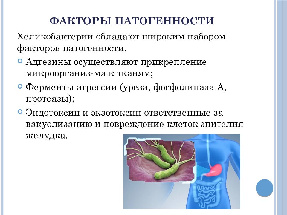 Хеликобактерии обладают широким набором факторов патогенности. Адгезины осуществляют прикрепление микроорганиз-ма к тканям; Ферменты агрессии (уреза, фосфолипаза А, протеазы ); Эндотоксин и экзотоксин ответственные за вакуолизацию и повреждение клеток эпителия желудка.