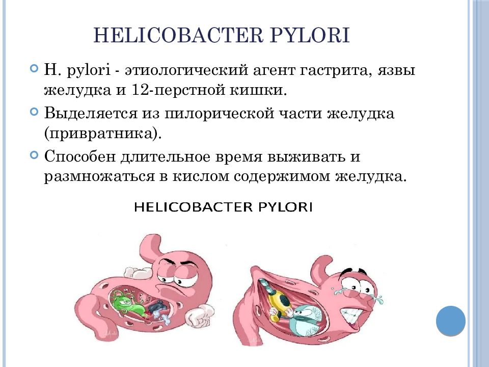 Н. pylori - этиологический агент гастрита, язвы желудка и 12-перстной кишки. В ыделяется из пилорической части желудка (привратника ). Способен длительное время выживать и размножаться в кислом содержимом желудка.