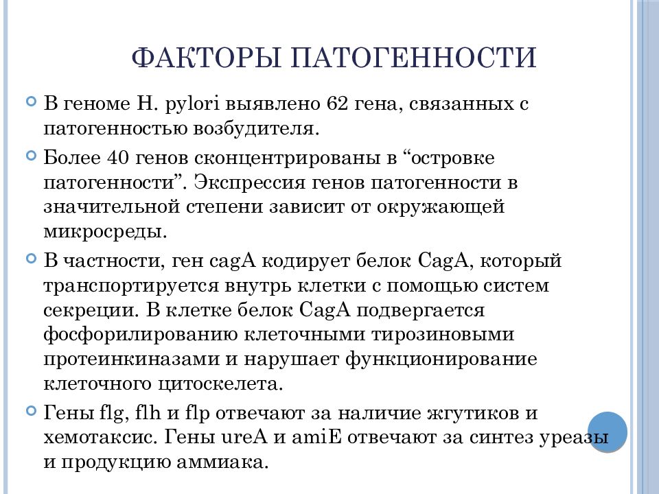 В геноме Н. рylori выявлено 62 гена, связанных с патогенностью возбудителя. Более 40 генов сконцентрированы в “островке патогенности”. Экспрессия генов патогенности в значительной степени зависит от окружающей микросреды. В частности, ген cagA кодирует белок CagA, который транспортируется внутрь клетки с помощью систем секреции. В клетке белок CagA подвергается фосфорилированию клеточными тирозиновыми протеинкиназами и нарушает функционирование клеточного цитоскелета. Гены flg, flh и flp отвечают за наличие жгутиков и хемотаксис. Гены ureА и amiE отвечают за синтез уреазы и продукцию аммиака.