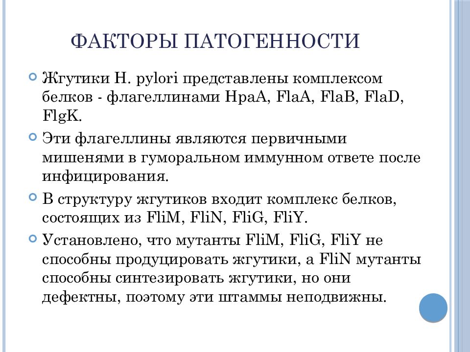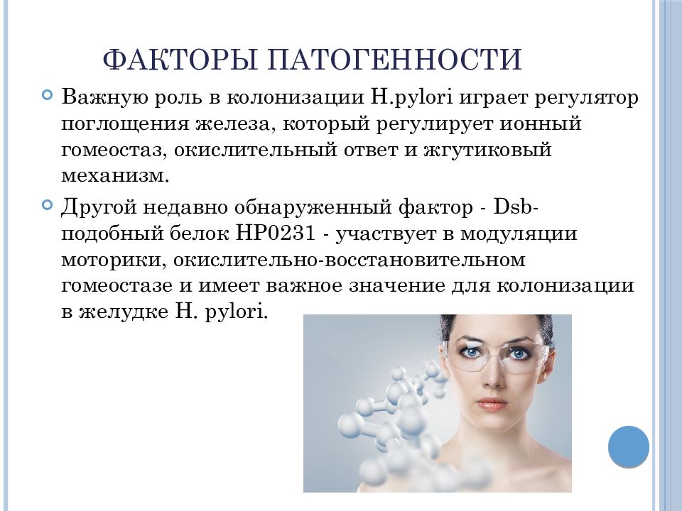 В ажную роль в колонизации Н.pylori играет регулятор поглощения железа, который регулирует ионный гомеостаз, окислительный ответ и жгутиковый механизм. Другой недавно обнаруженный фактор - Dsb -подобный белок НР0231 - участвует в модуляции моторики, окислительно -восстановительном гомеостазе и имеет важное значение для колонизации в желудке H. pylori.