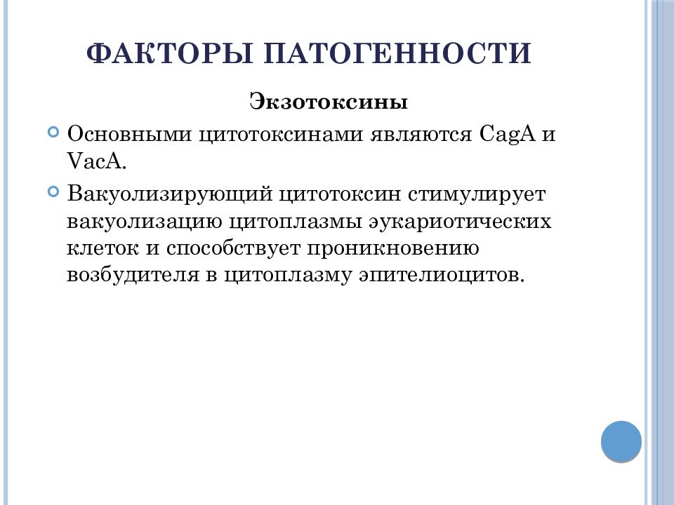 Экзотоксины Основными цитотоксинами являются CagA и VacA. Вакуолизирующий цитотоксин стимулирует вакуолизацию цитоплазмы эукариотических клеток и способствует проникновению возбудителя в цитоплазму эпителиоцитов.