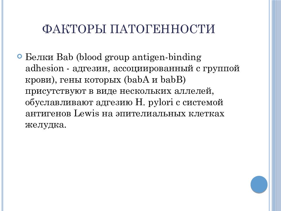 Белки Bab ( blood group antigen - binding adhesion - адгезин, ассоциированный с группой крови), гены которых ( babA и babB ) присутствуют в виде нескольких аллелей, обуславливают адгезию Н. pylori с системой антигенов Lewis на эпителиальных клетках желудка.